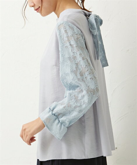 Tシャツ カットソー 大きいサイズ レディース 袖フラワー ジャガード 切替 シャイニー ブラウス サックスブルー/ネイビー LL〜10L ニッセン nissen